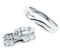 大切に譲り受けた10ピースのダイヤモンドリングを婚約指輪に5ピース、結婚指輪に 5ピース使用したリフォームのセットリングが完成。 ポイントは、すべてのダイヤを使用して譲り受けた感謝の気持ち受け継いだ指輪。 お二人の想いが、このような素敵な指輪になりました。 このたびは、おめでとうございます!