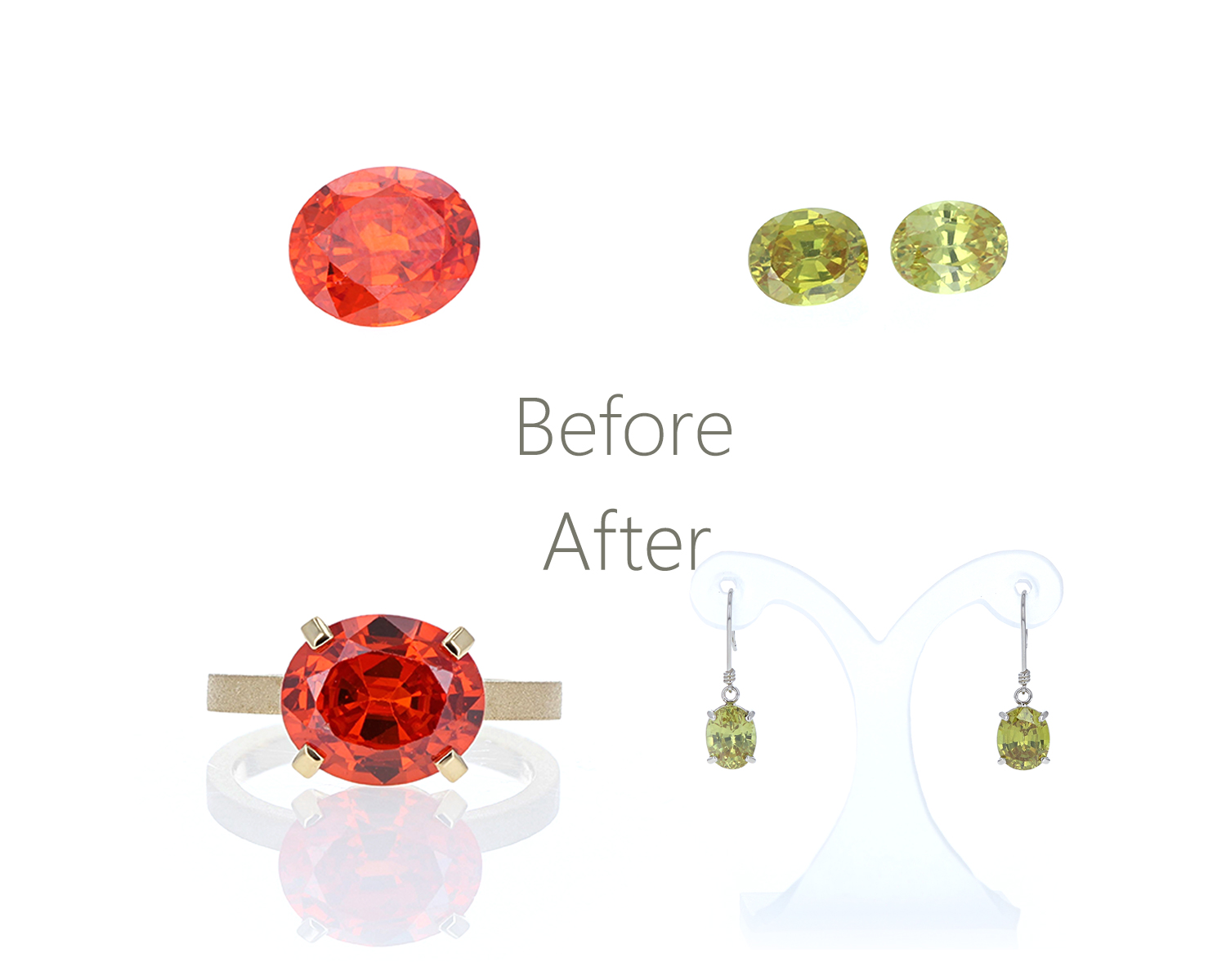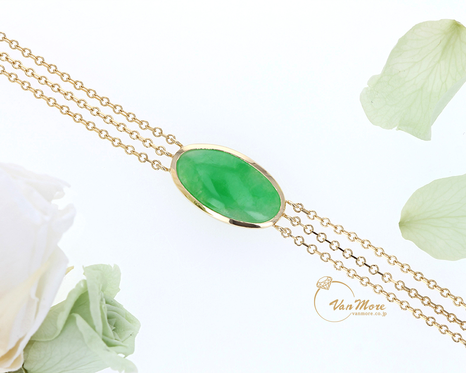 ブレスレットは宝石の形に個性がありましたのでその形ととてもきれいな緑色をいかしてイエローゴールドのジュエリーとして生まれ変わりました。