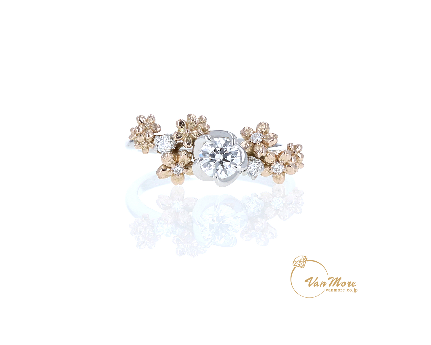 ちょうどそれが春の桜咲く季節にお決まりでということから、かなり斬新な「桜」というテーマでのエンゲージリング製作となりました。彼もまた、当店のことを知っているというとても気心知れた関係でしたので、普段より以上に思い切ったデザイン製作が出来ました♪。本当に桜が枝振りから咲き誇るような、そんな自然からも湧き上がる『おめでとうございます!』という祝賀ムードを最大限に表現したアートエンゲージリングになりました。指元で、いつどんな時も咲き誇っていられる、そんなお二人にピッタリなデザイン製作が出来たことを自分でも誇りに思います◎