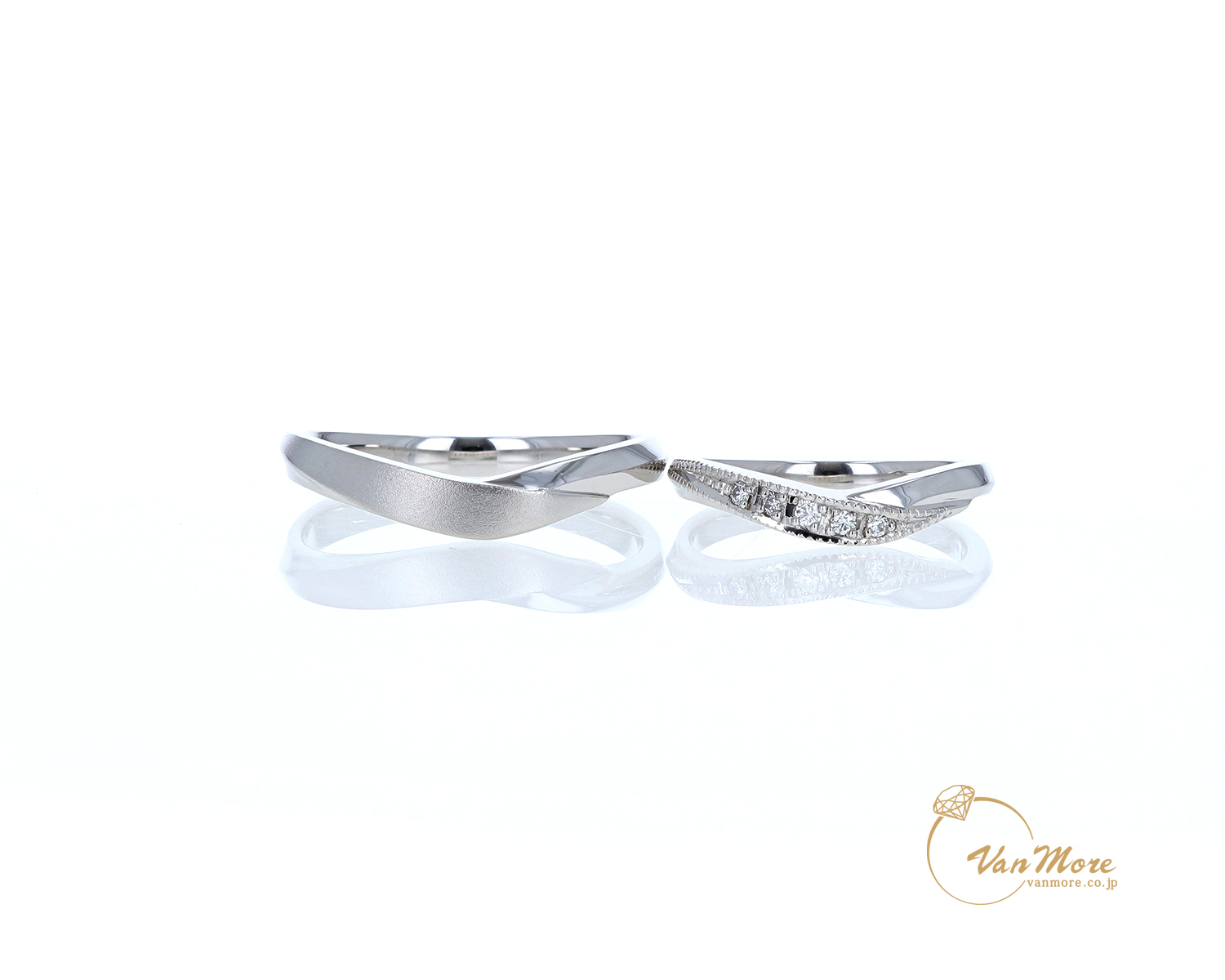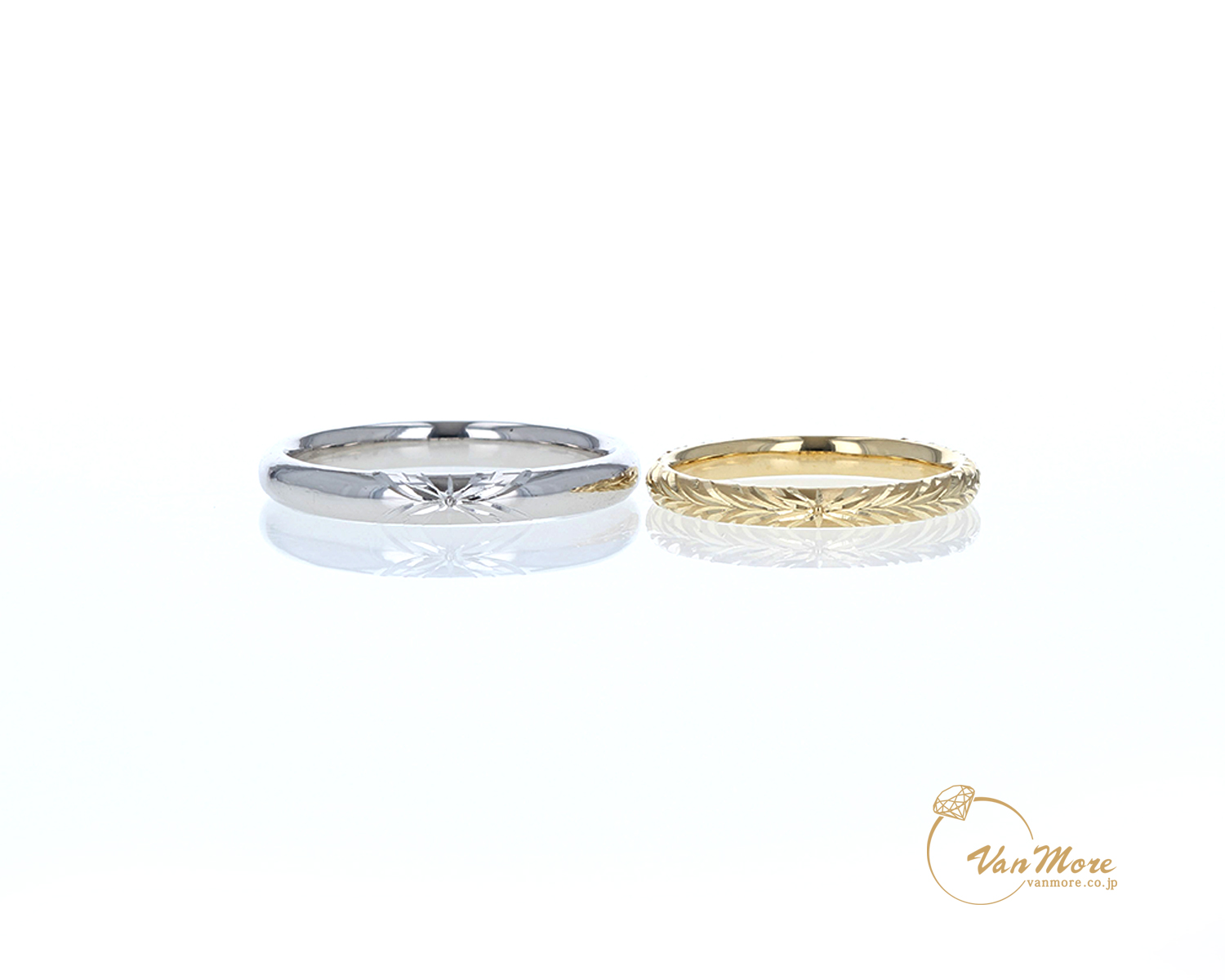 スタンダードなデザイン、マリッジリングは細身ながらも個性的なフォルムのデザインで