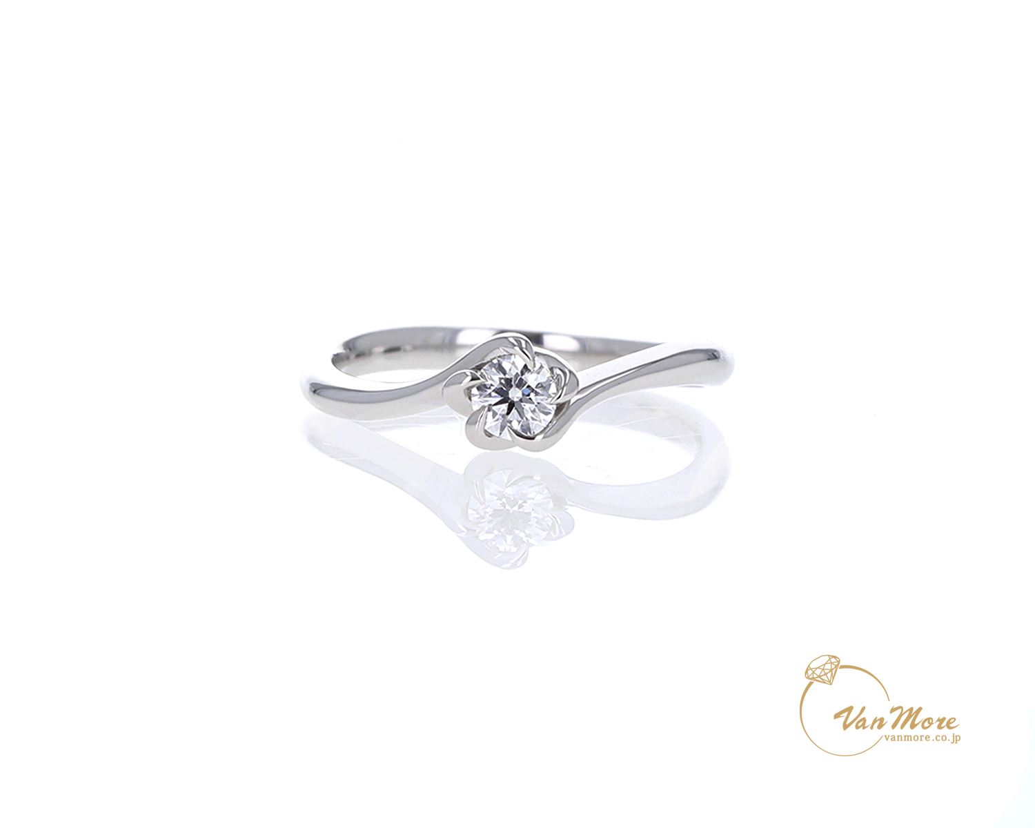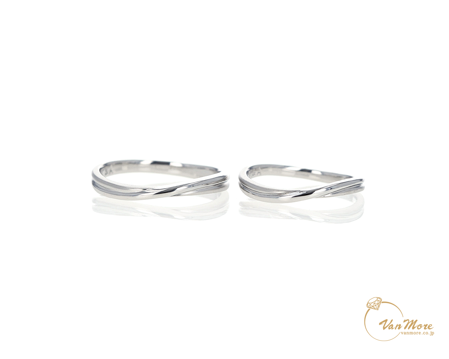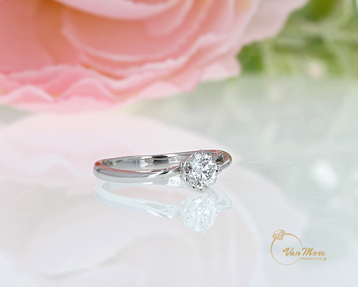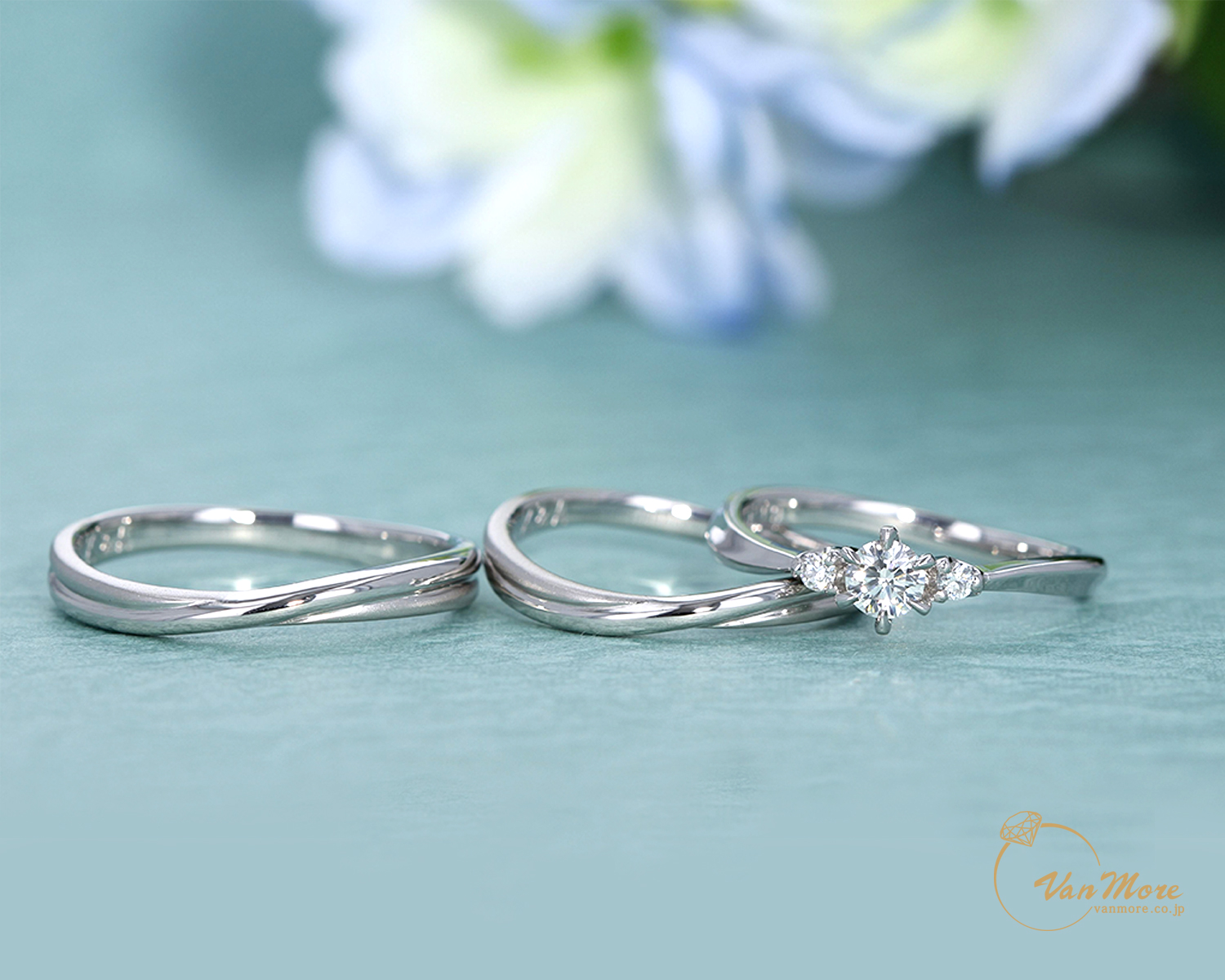 愛情あふれるダイヤモンドです。そのダイヤモンドが輝く指輪のデザインはゆるやかなS字カーブのデザイン。婚約指輪と結婚指輪が仲良く同じラインをえがいています。