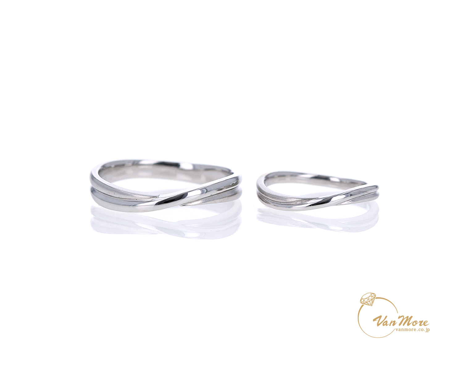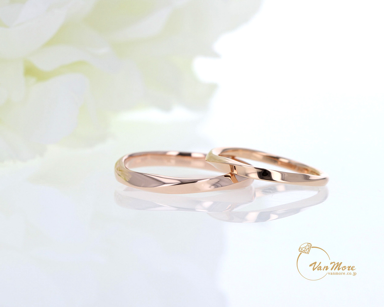 ご結婚指輪は、優しいお色のピンクゴールド。こちらも細目でシンプルなデザインですが、ツイストした面が輝きに変化を付け、さり気ない個性を発揮します。
