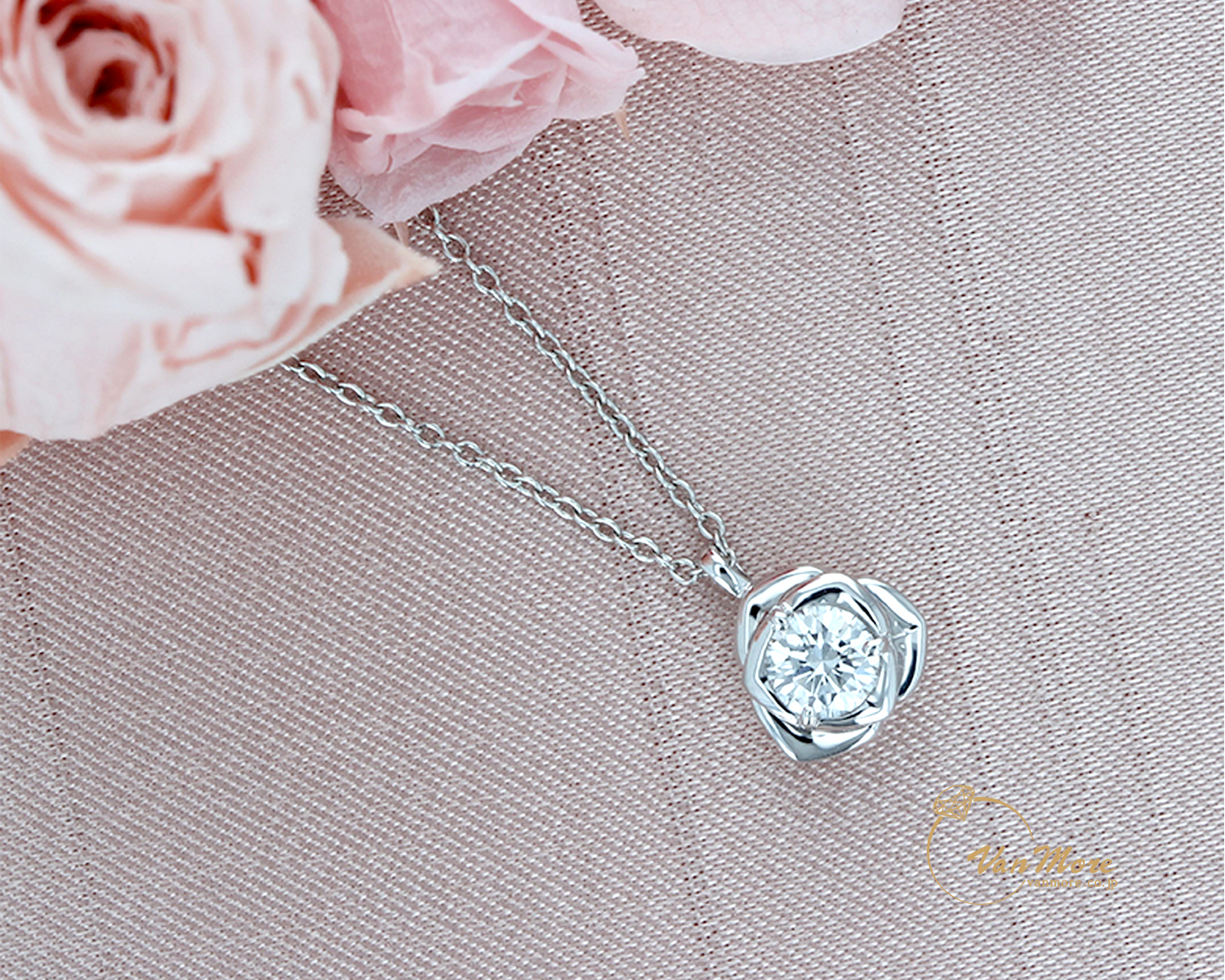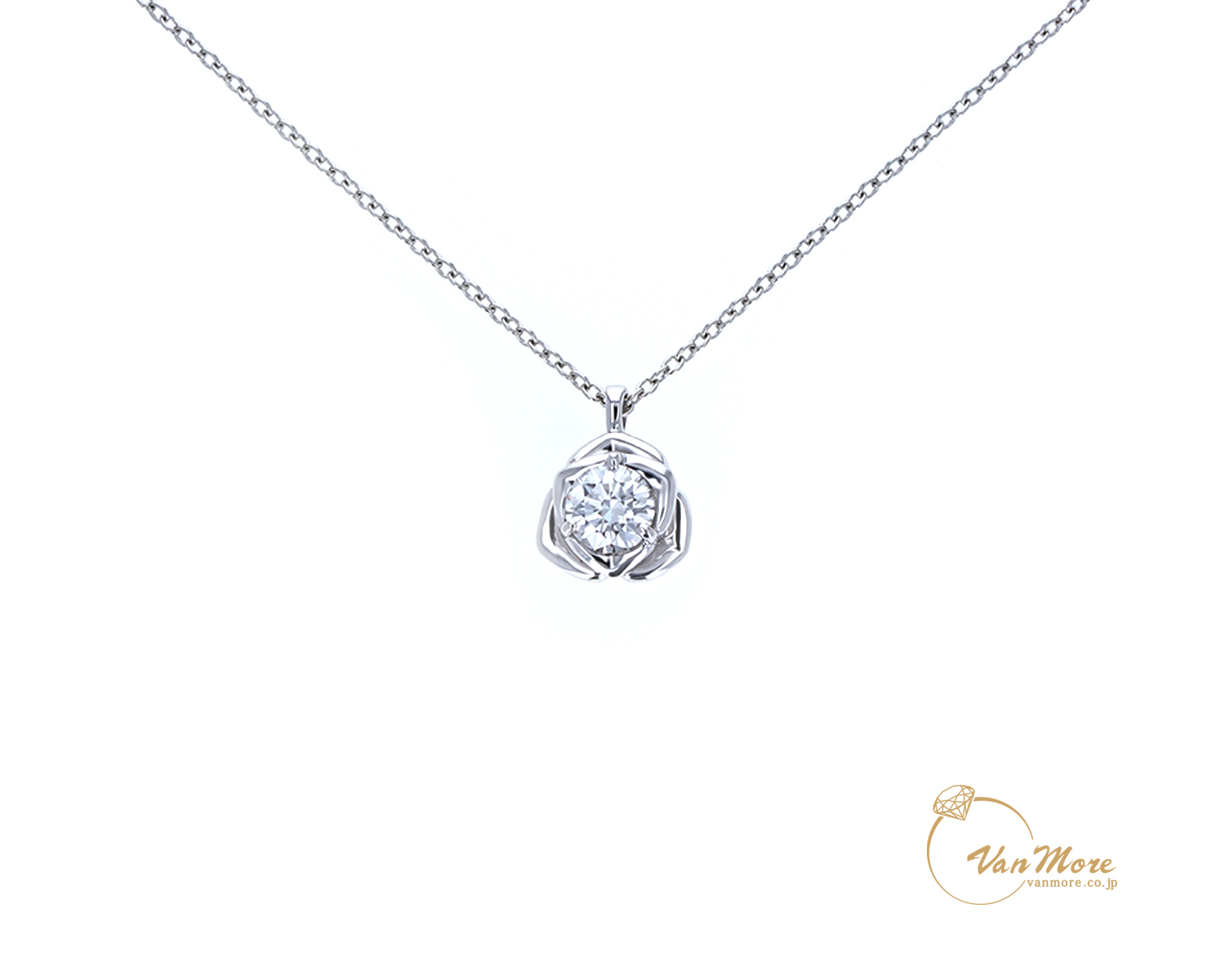 ぷっくりしたかわいらしい花びらの真ん中で、ハイクオリティダイヤモンドがいっそう輝いて咲く満開の薔薇のペンダントトップとなりました。