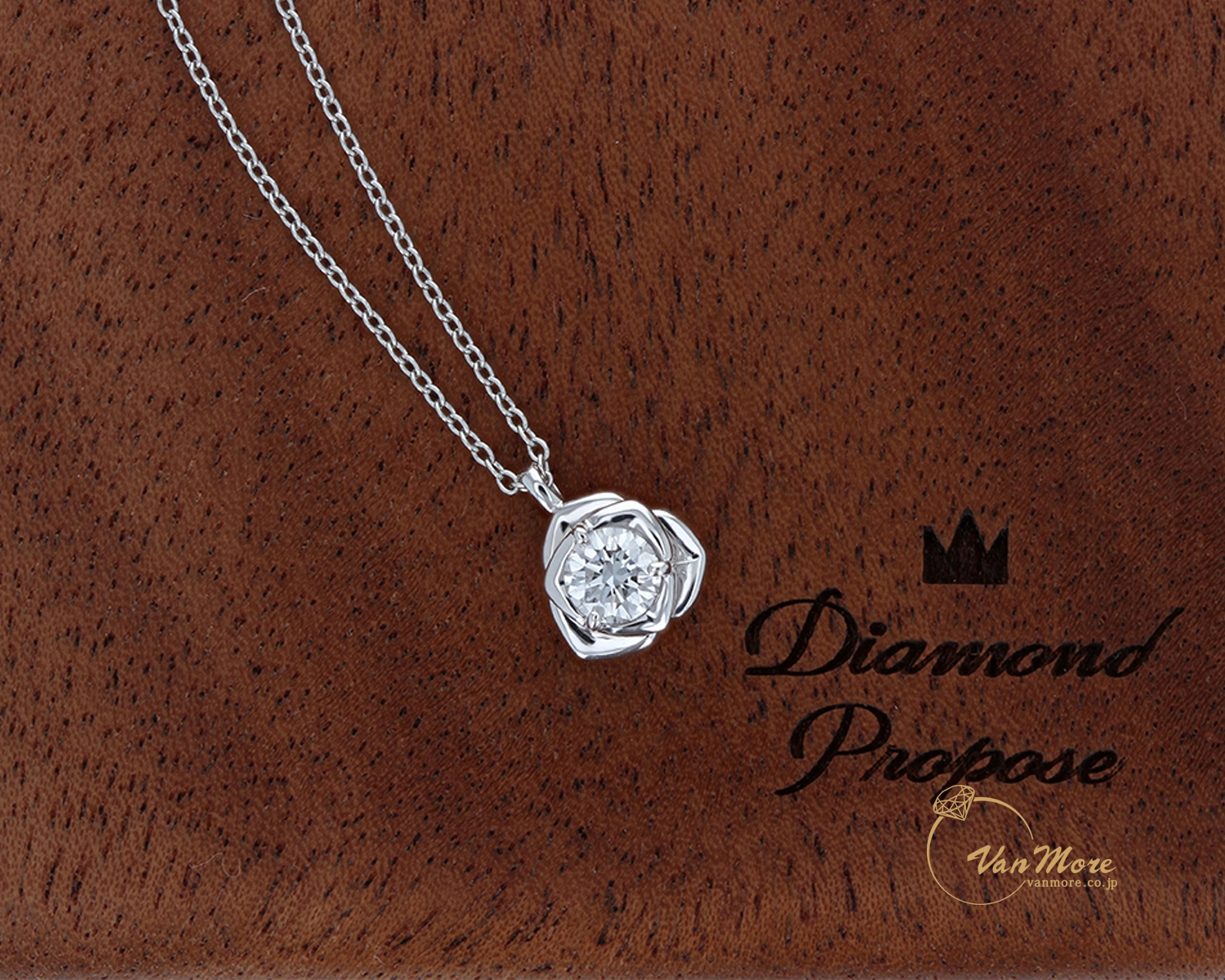 今回のお二人は、ダイヤモンドプロポーズを経て、指輪でなく婚約ネックレスを作りたいというご希望でしたので、数あるサンプルをご覧いただき、その中から、バラのお花のペンダントネックレスをお選びいただきました。
