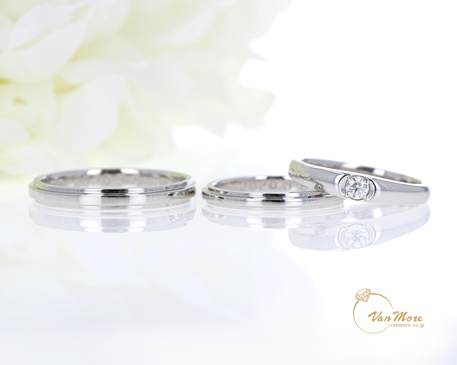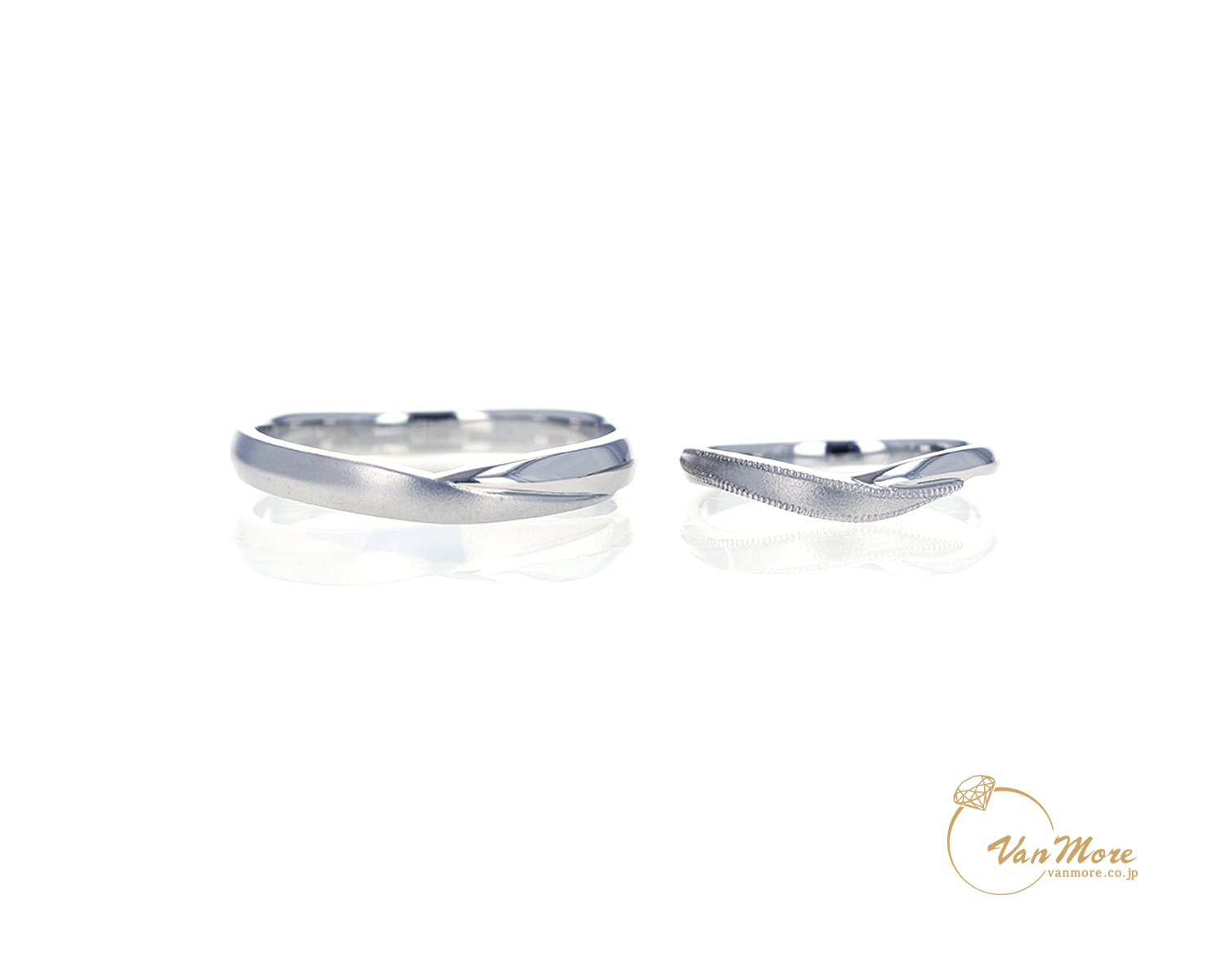 レディースは婚約指輪と重ねてセットで着けられるデザインにされました。