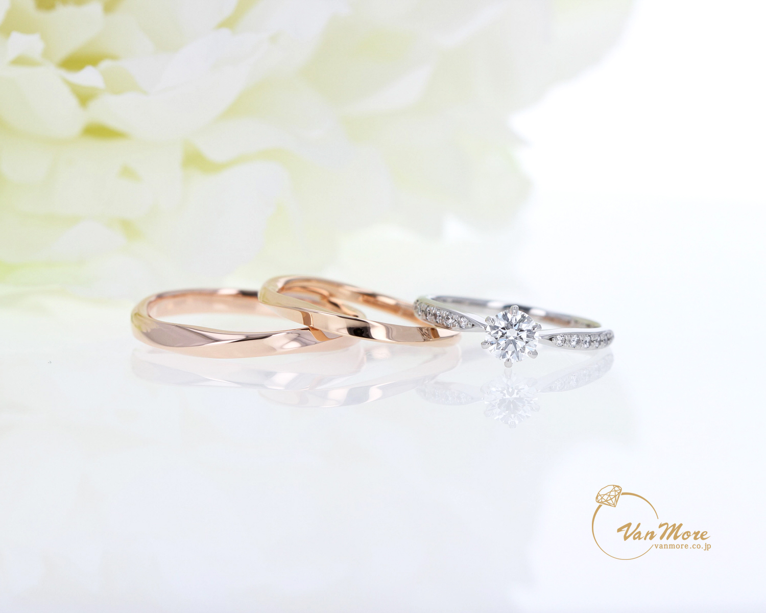 ご婚約指輪はカラーゴールドとの相性を考え、シンプルだけどダイヤモンドの輝きが美しいデザインをお選びいただきました。