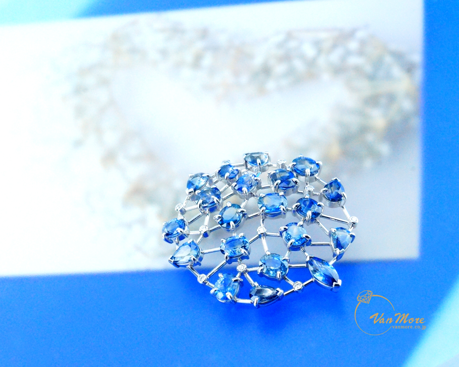 バラバラの形や色のグラデーションが活きるよう、あえて不規則な中に調和を求めました。サファイアの間にダイヤモンドを散りばめ、斬新なデザインにジュエリーとしての華やかさをプラス。お問い合わせ番号 P58646_P56267DPZT