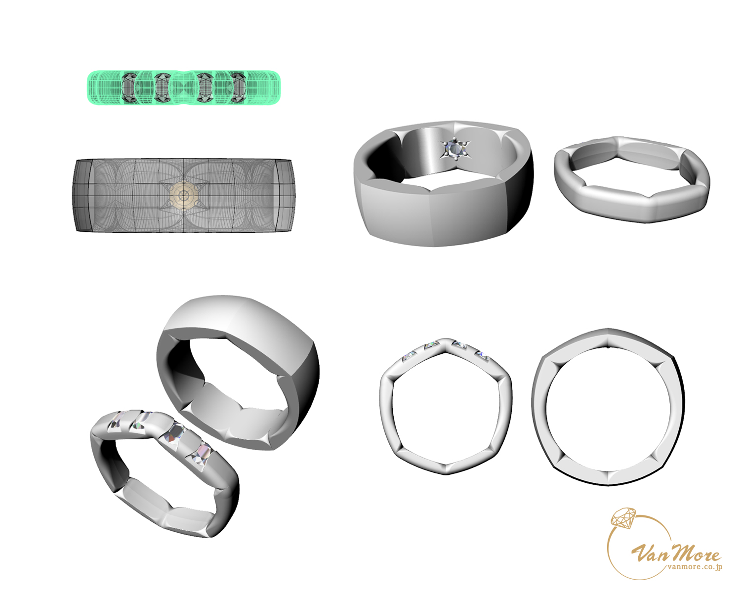 マリッジリングはまた、斬新なデザインを躊躇なく選ばれるお二人に、デザインする僕からもつい思い切ってしまって色々なアピールが詰まったオーダーの最高傑作となりました。二人のコンセプトを強く意識しながら自由なご提案を快く認めてくれて出来上がった作品をみて、不思議なぐらい飽きの来ないお二人を象徴するような形となりました。大切なお婆様より受け継いだダイヤモンド5石を分けあって構成したリングに、隠れミッキーのように色々な部分に豪華[亀]と[桜]の御祝い尽くし♪のデザインイメージで、職人&デザイナーとして感謝してもしきれないほどの制作でした。いつも何回かの打ち合わせで何気ない僕の長話ばかり…長くお付き合いいただきまして反省とありがとうございますの気持ちでいっぱいです(^^。まだ挙式は先ですが今後とも末永く宜しくお願いいたします。