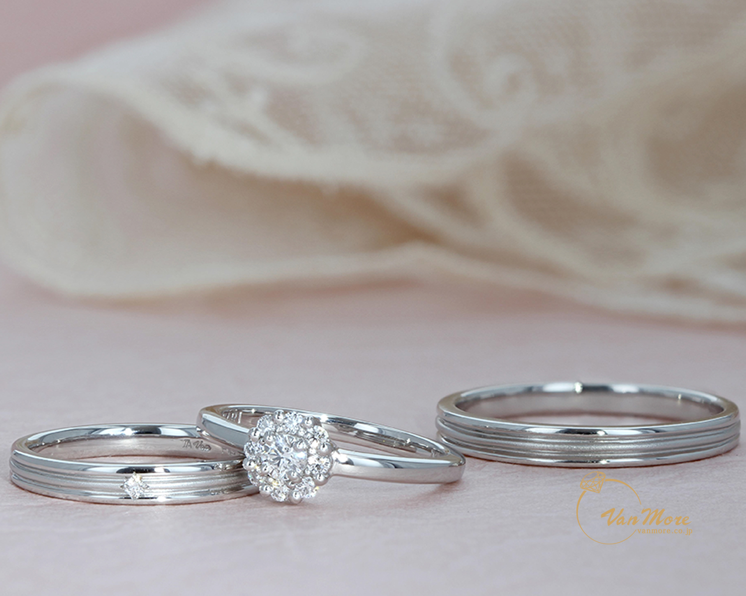 マリッジリングはプラチナの冴えたお色を感じる3本ラインのシンプルなデザイン。