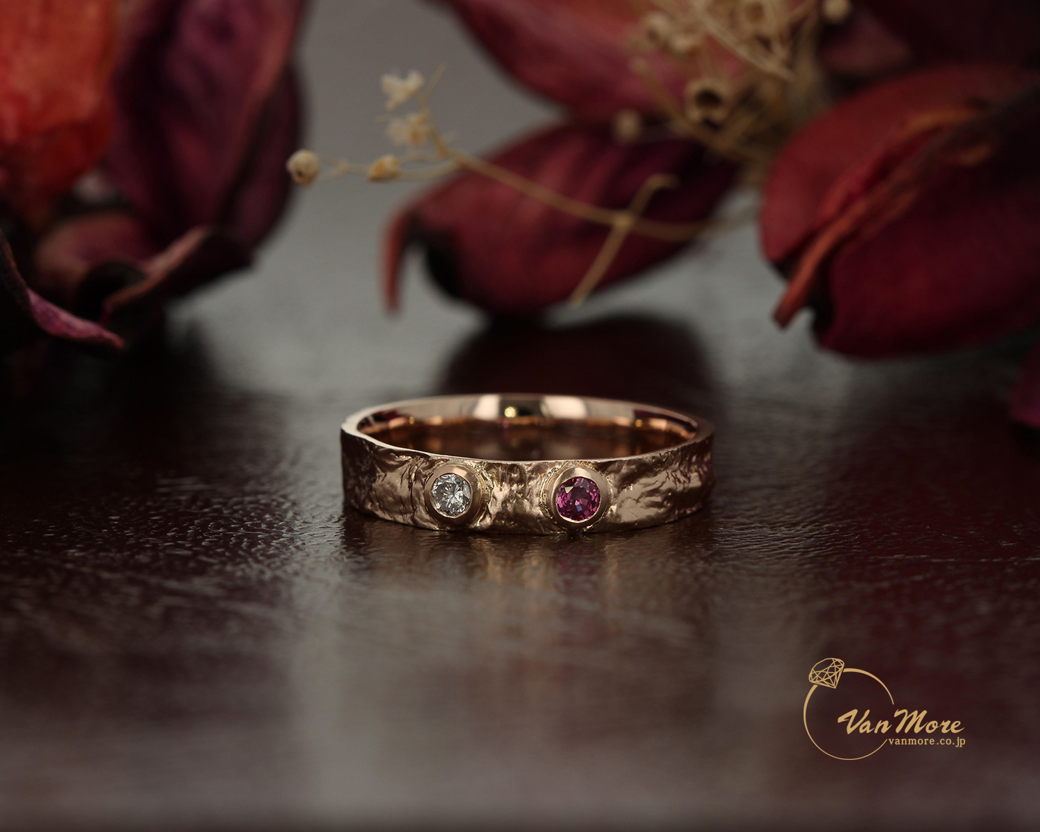 ルビーとダイヤモンドの大きさが似ていましたので、指輪に二つ埋め込んで引っ掛かりがないデザインへ。