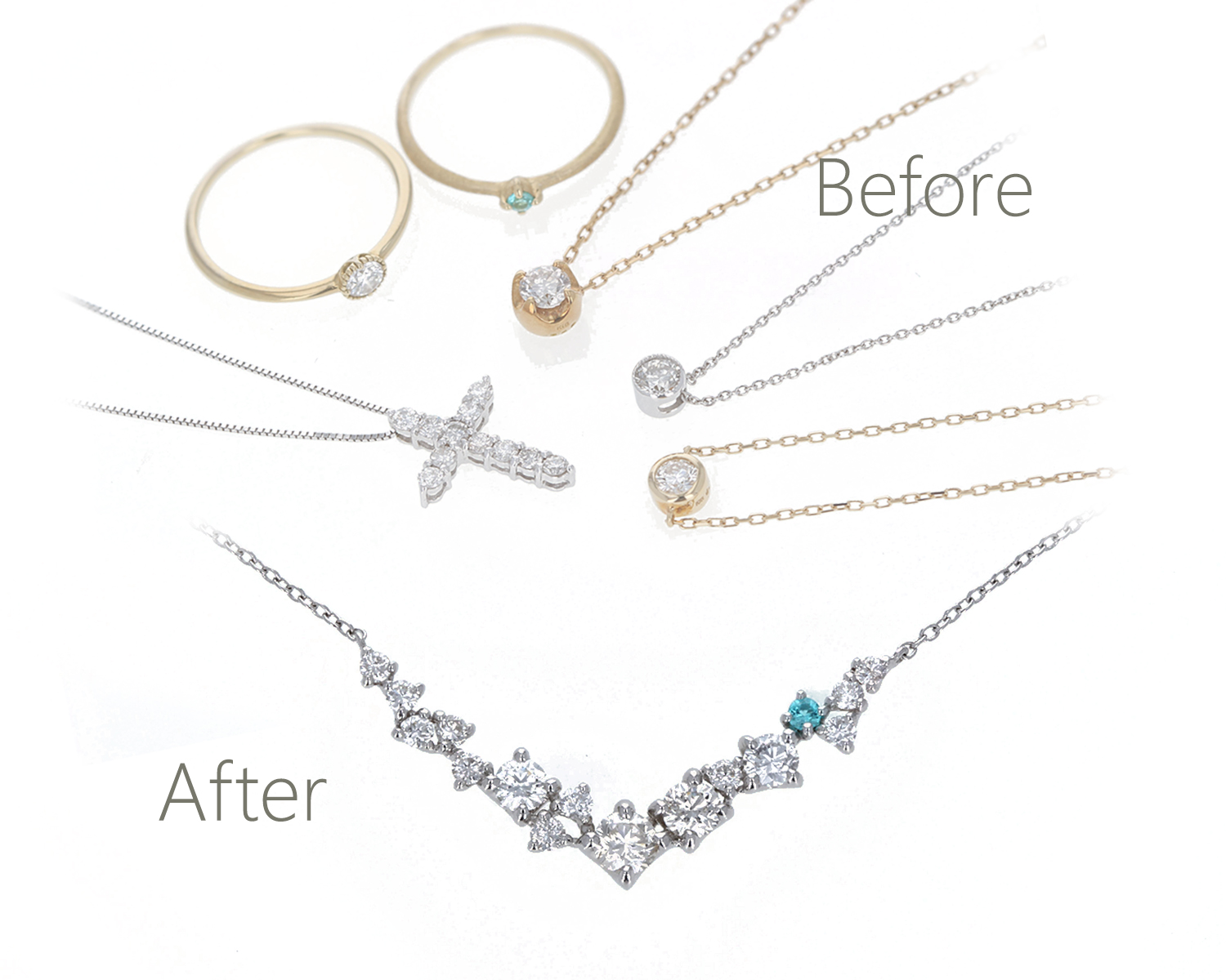 4年前に指輪のリフォームをさせていただきました。今回は、2つあるダイヤモンドペンダントを1つにするというご希望でした。大き目の1粒ダイヤモンドデザインをあまり着けなくなっていたとのこととても綺麗で大き目のダイヤモンドでしたので、2つを合わせることによって、輝きが増しました。これからの季節にもピッタリです。お問い合わせ番号 P60040_P60649_P56309FPZJ