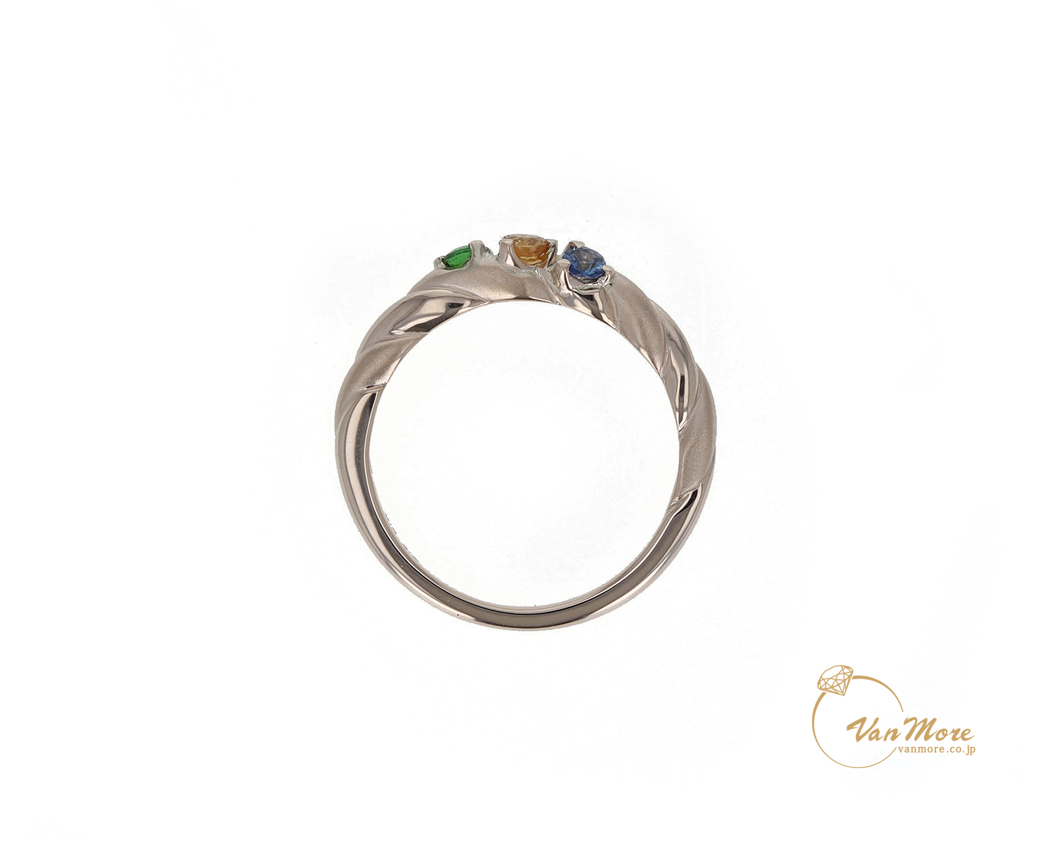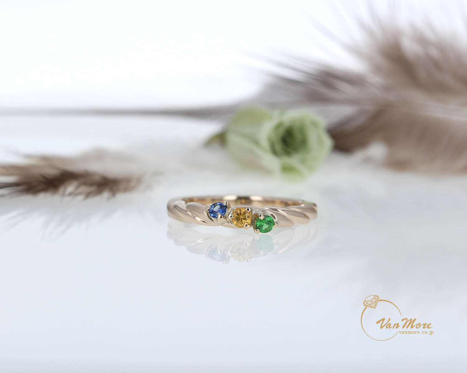 イエローとブルーのカラーサファイヤにグリーンガーネットを足してリングをお作りいたしました。