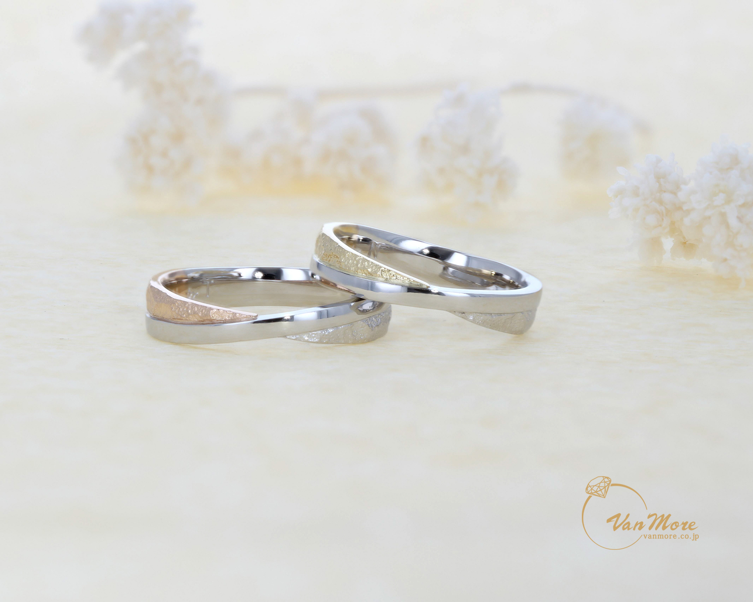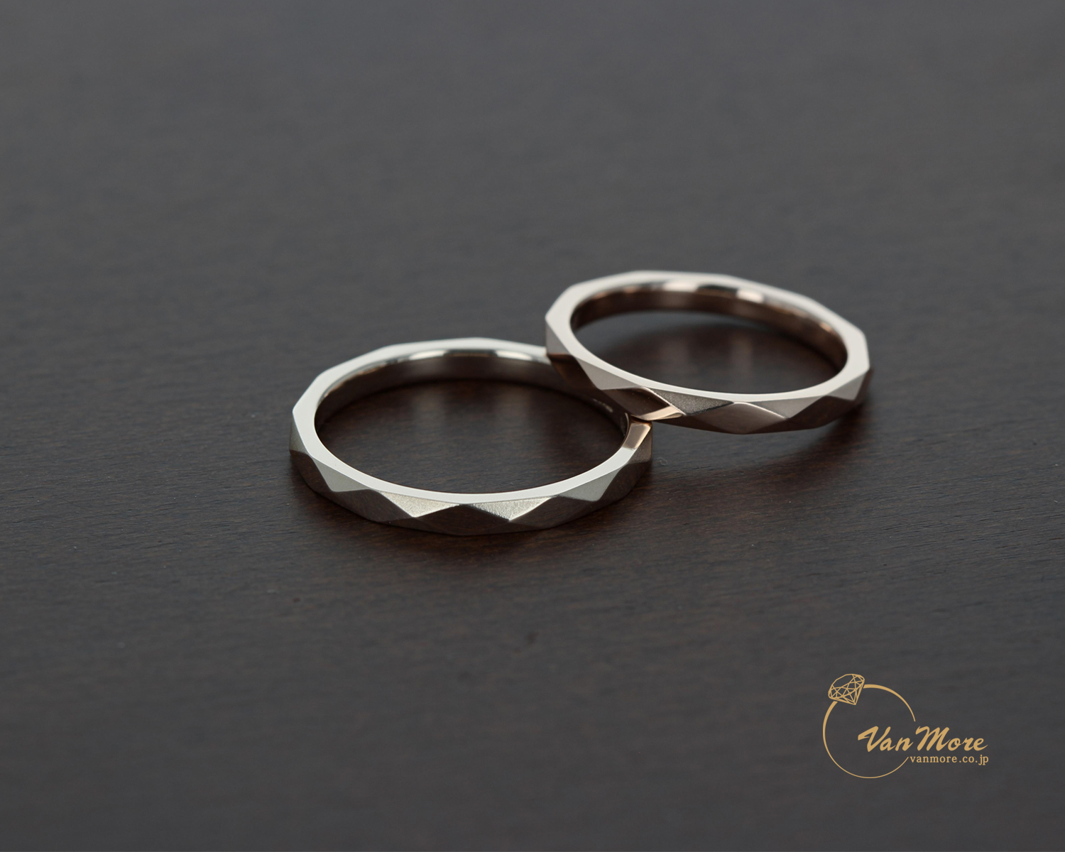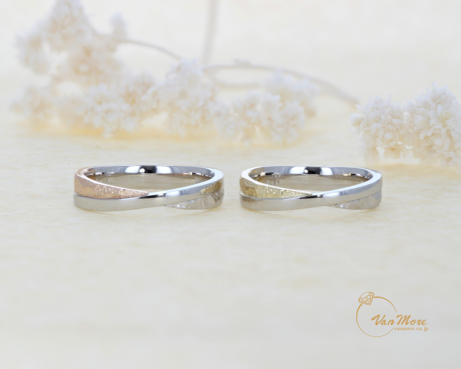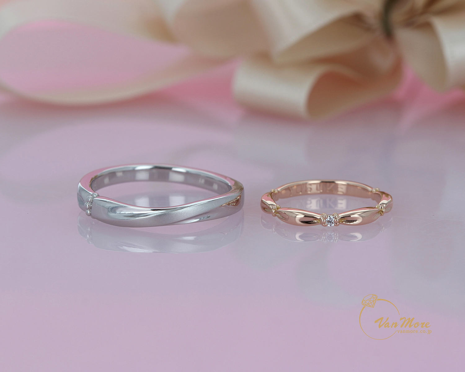 デザインは同じでも。2人の個性を色で表現素材もイエローぽい色味とピンクぽい色味に。更につや消しもこだわりました。シャープな中にも優しさが加わったマリッジリングになったと思います。
