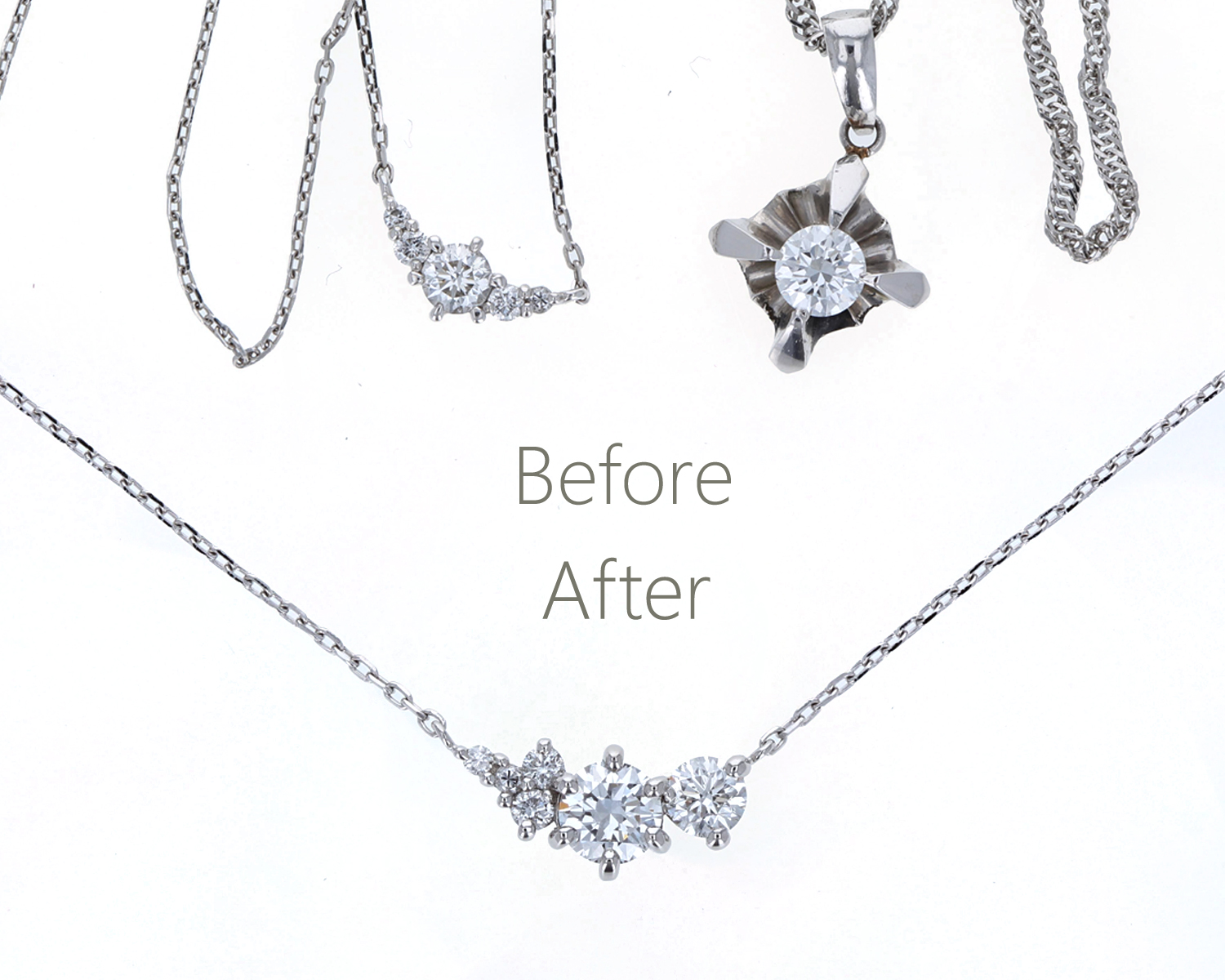 4年前に指輪のリフォームをさせていただきました。今回は、2つあるダイヤモンドペンダントを1つにするというご希望でした。大き目の1粒ダイヤモンドデザインをあまり着けなくなっていたとのこととても綺麗で大き目のダイヤモンドでしたので、2つを合わせることによって、輝きが増しました。これからの季節にもピッタリです。
