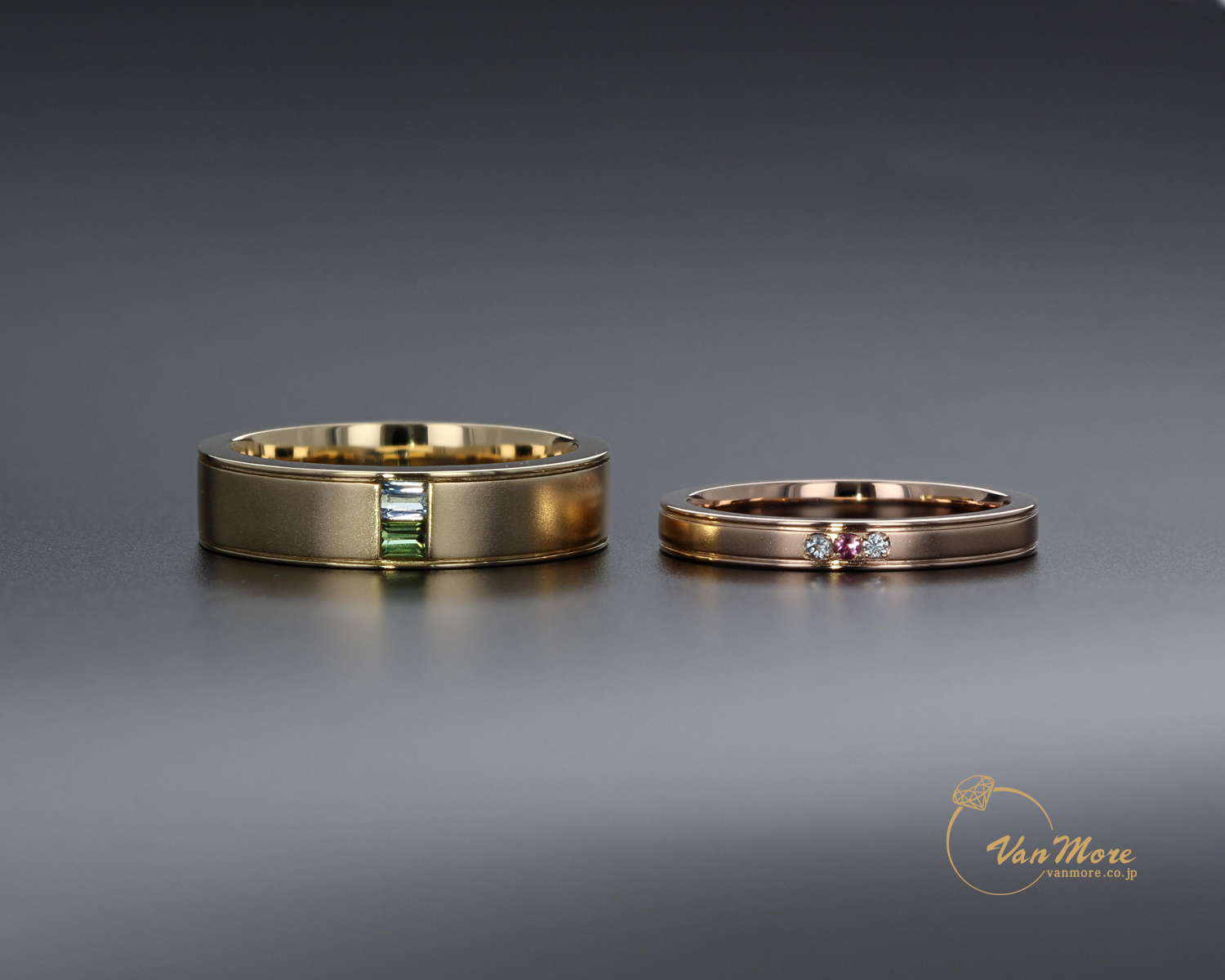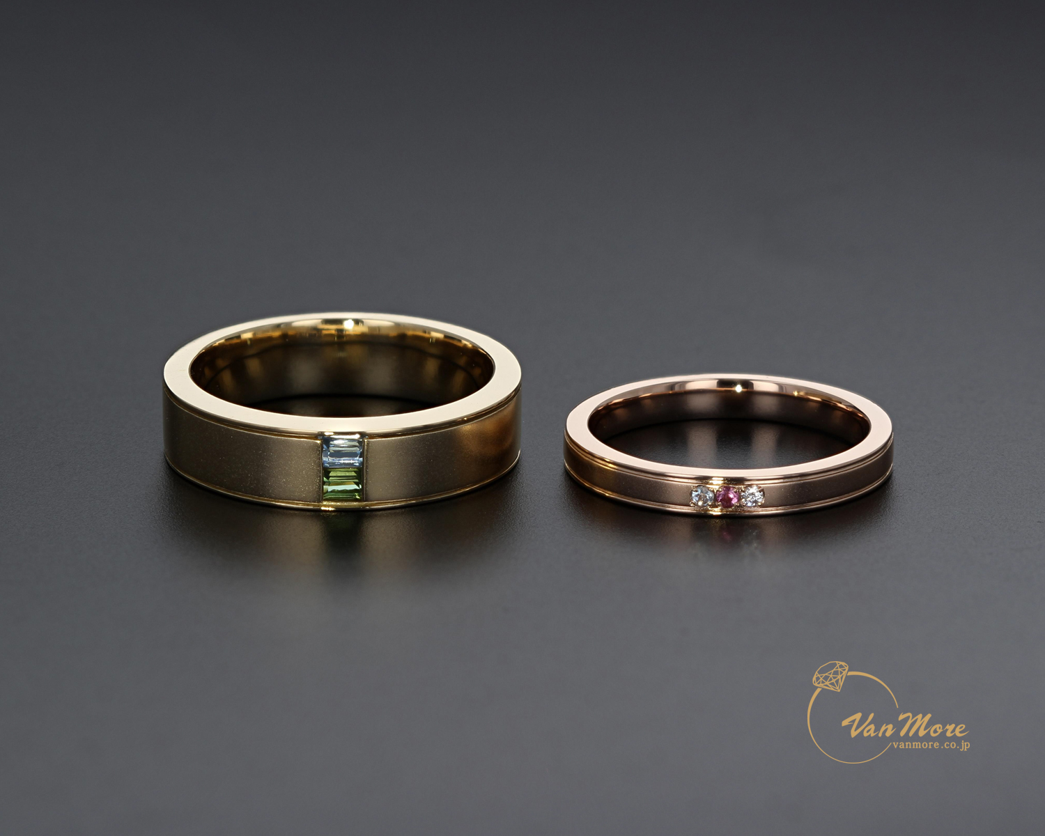 「トルマリンとアクアマリンを入れ、お2人の好みのデザインに仕上げました。」
