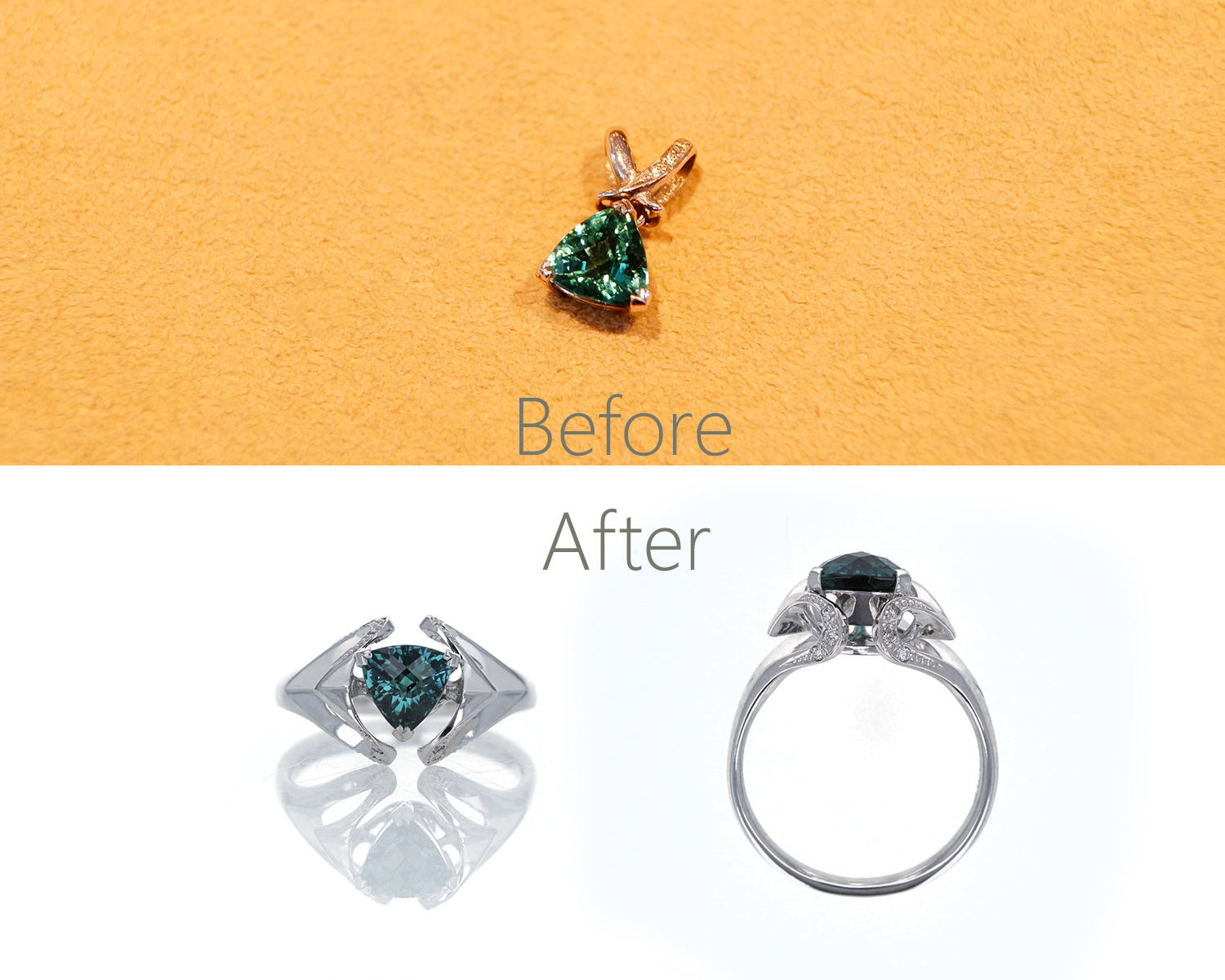 インディゴブルーのトルマリンのペンダントをお持ちで、とてもお気に入りだったそうですが小さすぎてあまり身に着ける気にならなかったそうです。なので今回思い切って指輪にリフォーム!見栄えも高さがあり、とても可愛いデザインになりました。一目で気に入って頂けたようで良かったです◎お問い合わせ番号 P60654_P56602DRZT