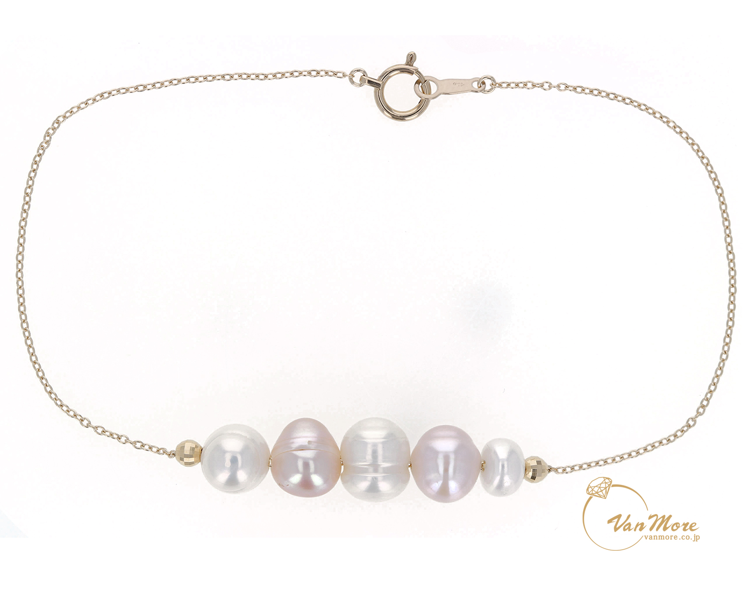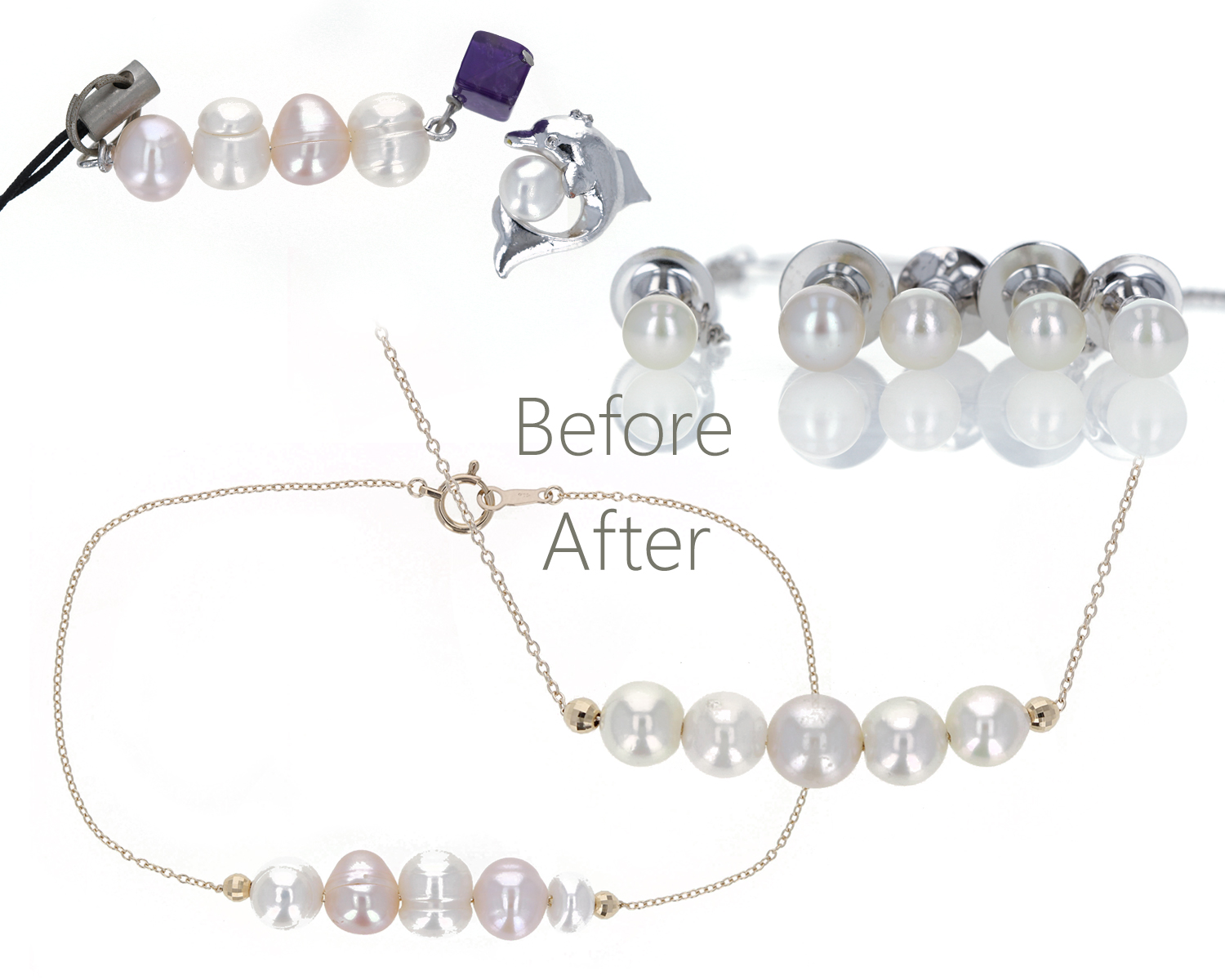 昔いただいたパールから、ピンタックについているパールまで複数お持ちでしたので何とか普段使いできないかとリフォームをされました。形も様々でしたのでブレスレットとネックレスにして普段でも身に着けやすいデザインにさせていただきました。パールは片穴でしたが、貫通穴にしてチェーンを通してクッションパーツで留めております。お問い合わせ番号 P60654_K56633FNZV