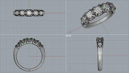 どのダイヤモンドも高品質で0.2ct以上のリング×5つ(画像は2つのリングまで掲載しています)を1つのリングにまとめてオーダーで制作させていただきました。総計1ct以上の華やかで普段使いしやすいデザインにしました。引っ掛かりにくく華やかなデザインにするため仮造形、シルバーサンプルで出来上がりイメージをしっかりと共有してオーダー制作いたしました。