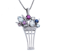 以前に購入された様々なジュエリーの石をまとめて使用して、 新しいペンダントをおつくりしたいというご希望でした。 お客様が控え目で美しい女性でしたので、花瓶に静かに咲き誇る花のイメージに まとめてみました。