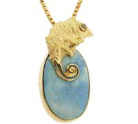 旦那様が奥様へプレゼントとして購入してこられたボルダーオパールを、 カメレオンのデザインペンダントにしたいということになりました。 かなり斬新なご提案より完成した作品です。 とても個性的!